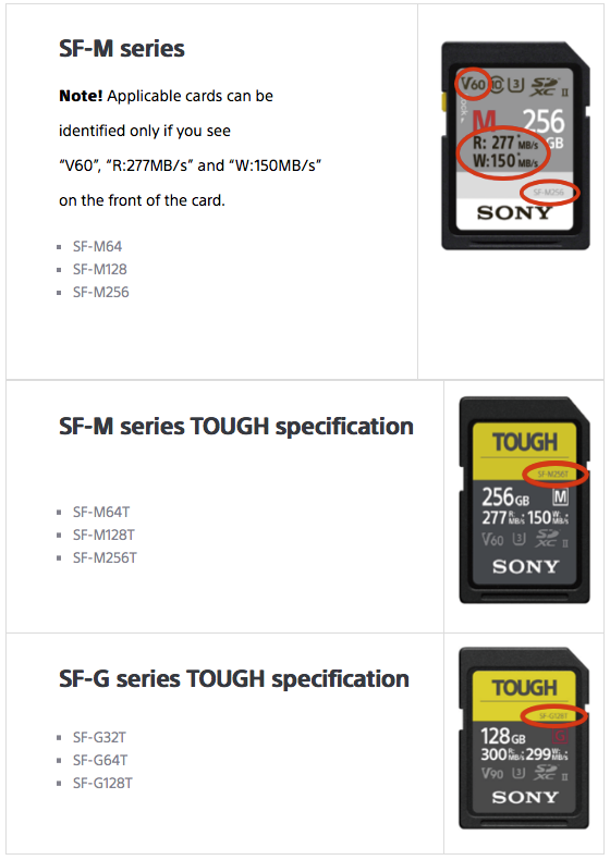 Sony issued a replacement program (a recall in common parlance) for some SD cards on 18 June, 2020 relating to their SF-M series, as well as their two Tough spec series, the SF-M (T) and SF-G (T). If your cards have an asterisk before the lower of the two serial numbers on the reverse side of the card or start with TR (SF-G Tough only) then your card is unaffected.